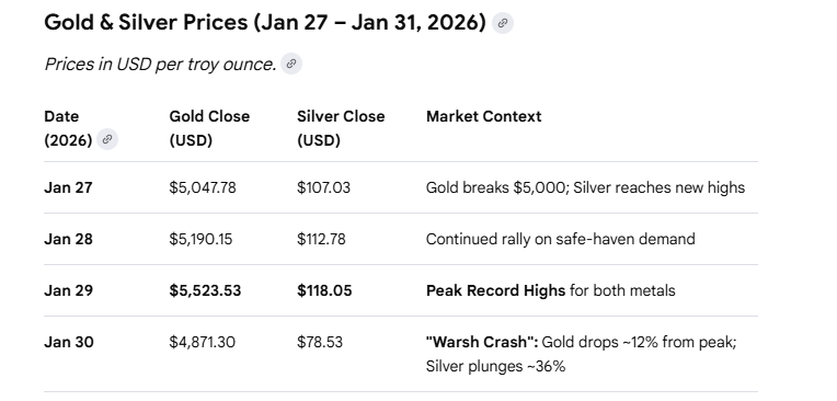 सुन जनवरी २९ को लगभग $५,६०० प्रति औंसको शिखरबाट १२% ले घटेर लगभग $४,८०० मा पुगेको छ, जुन एक दशक भन्दा बढी समयको सबैभन्दा ठूलो एक-दिनको घाटा हो, यद्यपि यो अझै पनि वर्ष-दर-वर्ष लगभग ६५% ले बढेको छ। चाँदी, जुन गत वर्ष सुनको वृद्धिलाई उछिनेको थियो, ३०% भन्दा बढीले प्रति औंस $८० भन्दा कममा झरेको छ, जुन १९८० पछिको सबैभन्दा खराब गिरावट हो। यो हारले २४ घण्टामा सुन र चाँदीको मूल्यबाट $७.४ ट्रिलियन भन्दा बढीको क्षति पुर्यायो, जुन अमेरिकी अर्थतन्त्रको लगभग एक चौथाई बराबर हो।