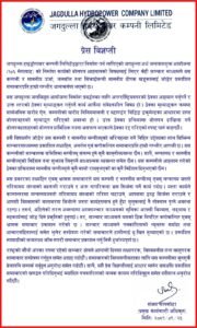 जगदुल्ला हाइड्रोपावर कम्पनी लिमिटेडले जगदुल्ला अर्ध जलाशययुक्त आयोजना (१०६ मेगावाट) को निर्माण कार्यको बोलपत्र आह्वानको प्रक्रियालाई लिएर उर्जा, जलस्रोत तथा सिंचाईमन्त्री दीपक खड्का र आफ्नो कम्पनीको चरित्रहत्या गर्न खोजिएको बताएको छ ।कम्पनीका प्रमुख कार्यकारी अधिकृत संजय सापकोटाले आज एक विज्ञप्ति जारी गरी जगदुल्ला हाइड्रोपावर कम्पनी लिमिटेडले निर्माण गर्न लागेको जगदुल्ला जलविद्युत आयोजनाको निर्माण कार्यको बोलपत्र आह्वानको विषयलाई लिएर केही सञ्चार माध्यामले आफ्नो कम्पनी र उर्जामन्त्रीको चरित्रहत्या गर्न खोजेको भन्दै गम्भीर ध्यानाकर्षण भएको बताएका हुन् ।“यस जगदुल्ला जलविद्युत आयोजना निर्माण प्रवद्र्धनका लागि अन्तर्राष्ट्रियस्तरको ठेक्का आह्वान गर्नुपर्ने र उक्त स्तरको ठेक्का मूल्याङ्कन गर्नुपर्ने कार्य आँफैमा संवेदनशील विषय हो, ठेक्का मूल्याङ्कन क्रममा सार्वजनिक खरीद ऐन, कम्पनीको खरीद विनियमावली र स्टाण्र्डर विडिङ डकुमेन्टका आधारमा प्राप्त बोलपत्रहरुको मूल्याङ्न गरिएको अवस्था हो, उक्त ठेक्का प्रक्रियामा बोलपत्र दाखिला गर्ने बोलपत्रदाताहरुको बोलपत्र प्राविधिक रुपमा असफल भएकाले ठेक्का रद्द गरिएको स्पष्ट पार्न चाहन्छौँ,”–कम्पनीद्धारा जारी विज्ञप्तीमा भनिएको छ ।जगदुल्लाले आफ्नो कम्पनीको विषयसँग जोडेर माननीय मन्त्रीज्यूको चरित्रहत्या गर्ने निहित उदेश्यका साथ विभिन्न सञ्चारमाध्यममा प्रकाशित तथ्यहिन, अनर्गल एवं कपोलकल्पित समाचारप्रति गम्भीर आपत्ती जनाएको छ ।