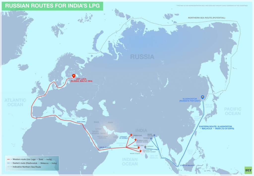 रूसको तर्फ, मुख्य एलपीजी निर्यात प्रवेशद्वार उस्ट-लुगाको बाल्टिक बन्दरगाह हो, जहाँ सिबुर टर्मिनलले तरल ग्यास ह्यान्डल गर्दछ। २०२४-२५ मा, उद्योग रिपोर्टहरूले संकेत गरे कि जनवरी-मे २०२५ को तुलनामा उस्ट-लुगाबाट एलपीजी निर्यात लगभग दोब्बर भयो किनभने युरोपेली खरीददारहरू पछि हटे र निर्यातकर्ताहरू एसियातिर लागे, र ढुवानी गुप्तचरले प्रवाह पुनः सुरु भएपछि लगभग ४०,००० टन भारत जाने कम्तिमा दुई कार्गोहरू उल्लेख गरेको छ।