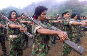 फालिन्टिल (पूर्वी टिमोरको मुक्तिका लागि सशस्त्र बल) का सैनिकहरूले अगस्ट ७ मा पूर्वी टिमोरको विक्वेक जिल्लामा रहेको आफ्नो छापामार आधारमा अभ्यास गर्छन्। १९७५ मा इन्डोनेसियाली आक्रमणदेखि स्वतन्त्रताको लागि छापामार युद्ध लडिरहेको फालिन्टिलले अगस्ट ३० मा क्षेत्रको भविष्यको बारेमा मतदान हुनुभन्दा पहिले संयुक्त राष्ट्र संघको निरीक्षणमा आफ्ना लडाकुहरूलाई शिविरहरूमा सीमित राख्न सहमत भएको छ।