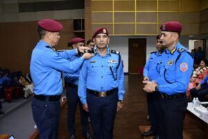 प्रहरी अतिरिक्त महानिरीक्षक पदमा पदोन्नति हुनुभएका ४ जना प्रहरी अतिरिक्त महानिरीक्षकज्यूहरूलाई दर्ज्यानी चिन्हद्वारा सुशोभित गर्नुहुँदै प्र.म.नि. चन्द्र कुबेर खापुङ्गज्यू