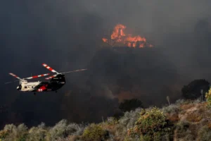 लस एन्जलस, क्यालिफोर्नियाको पश्चिमी भागमा हावाको आँधीका क्रममा पालिसेड्सको आगो जलेको बेला हावाले अंगुरलाई उखेल्छ।लस एन्जलसको इतिहासमा सबैभन्दा खराब जङ्गली आगोले अन्तरिक्षबाट देखिने आगोको अर्धचन्द्रसहित सहरभरि फैलिएको कारण बिहीबार बिहान हलिउड हिल्स अनियन्त्रित रूपमा जलिरहेको थियो।