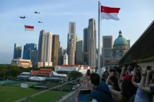 देशको ५७ औं राष्ट्रिय दिवस मनाउन अपाचे हेलिकप्टरहरूले सिंगापुरको झण्डासहित परेड गर्दै गरेको वायु सेनाको चिनूक हेलिकप्टरको स्वागतमा दर्शकहरूले हर्षोल्लास मनाए,सिंगापुरले ६० औं वार्षिकोत्सवमा सफलता मनाउँदैछ तर चुनौतीहरू अगाडि छन्!