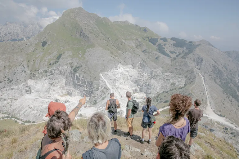 कारारा, इटाली – बिहानको समयमा, अपुआन आल्प्सका दाँतेदार चुचुराहरू टायरेनियन समुद्रभन्दा माथि उठेको देख्न सकिन्छ, तिनीहरूका तीखा सिल्हूटहरू तलको स्थिर पानीमा प्रतिबिम्बित हुन्छन्। हावा र वर्षाले सहस्राब्दीमा आकार दिएका – र हालैका शताब्दीहरूमा खानीद्वारा – यी पहाडहरूको गहिरो दाग लागेको उपस्थिति छ।
