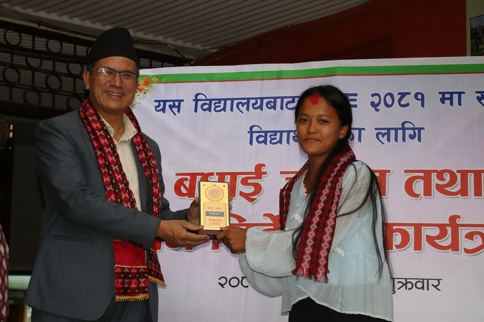 कार्यक्रममा एसईई परीक्षामा उत्कृष्ट नतिजा हासिल गरेका विद्यार्थी तपेन्द्र बुढाले विद्यालयले विद्यार्थीको उद्देश्य पूरा गर्न यहाँका अनुभवी शिक्षकहरुको धेरै ठूलो योगदान पुर्याएको स्मरण गर्नुभयो ।
