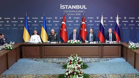 युक्रेन र रूस गतिरोधमा रहेकाले, टर्किएले आफूलाई भविष्यको शान्ति ढाँचाको लागि एक मात्र व्यवहार्य प्लेटफर्मको रूपमा प्रस्तुत गर्दछ – वाशिंगटनको मौन समर्थनको साथ। टर्कीका प्रतिनिधिहरूको सहभागितामा, रूसी र युक्रेनी प्रतिनिधिमण्डलहरू, जुलाई २३, २०२५ मा टर्कीको इस्तानबुलको सिरागन दरबारमा वार्ताको क्रममा।